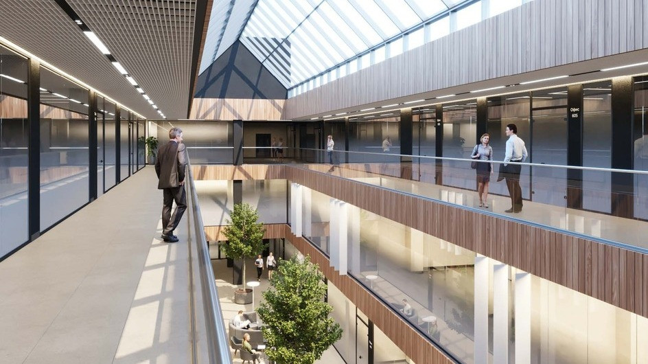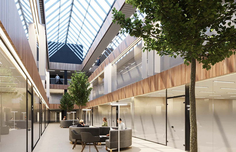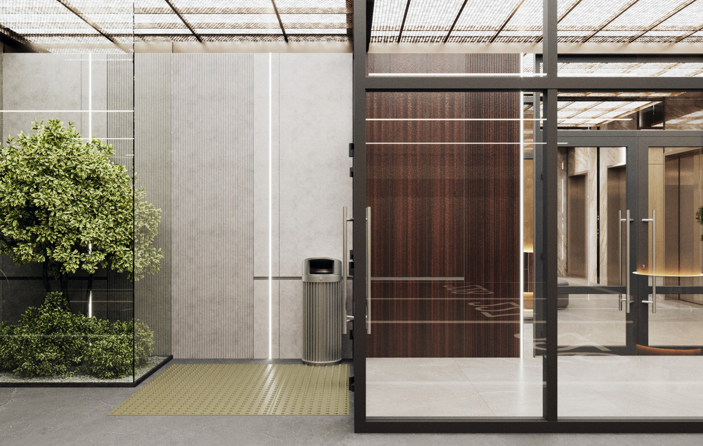 Премиальный интерьер. Дизайнерские холлы коммерческих этажей с lounge-зонами, живыми растениями и отдельными переговорными комнатами.