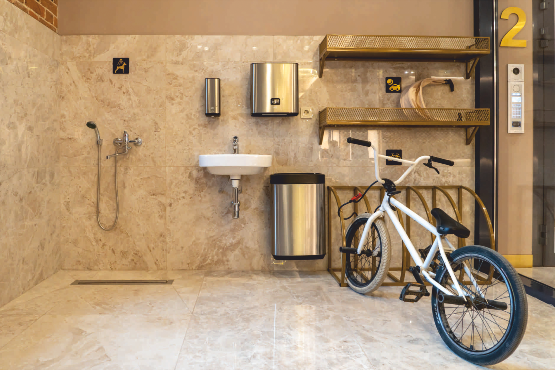 В холлах первых этажей расположены просторные помещения со специальным оборудованием для хранения велосипедов, колясок и спортивного инвентаря.