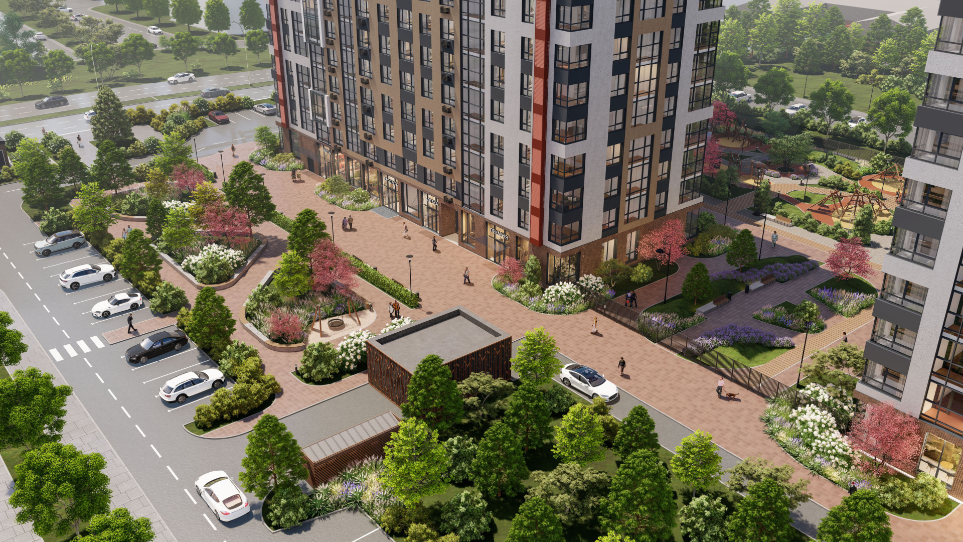 Совместно с компанией Urban Green разработан проект по благоустройству внутренней территории с дорожками для катания на роликах, беседками, бесплатным Wi-Fi. Специально подобранные гипоаллергенные растения позволяют внутреннему пространству комплекса круглый год цвести и радовать жителей разнообразием красок.
