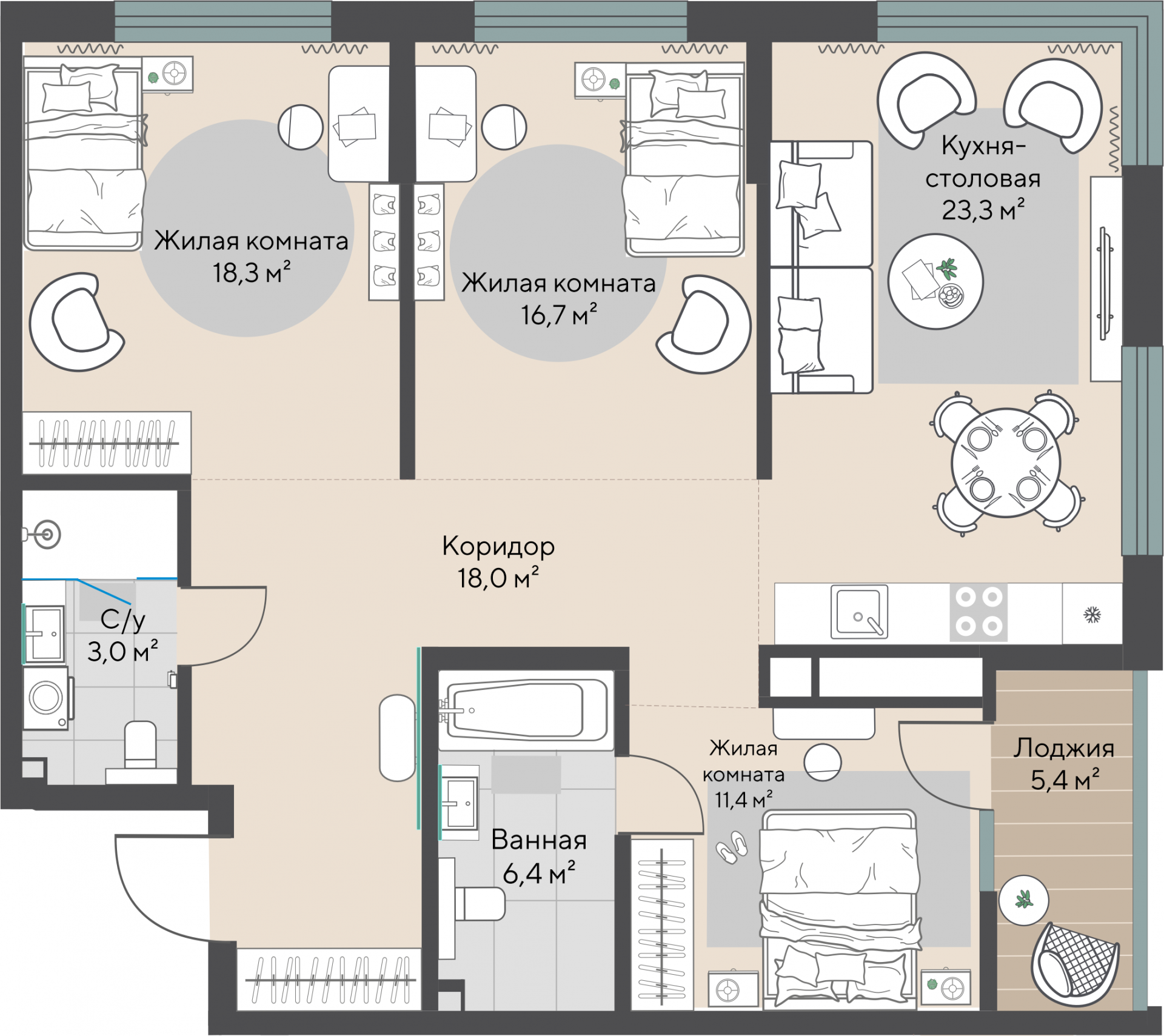 3-комнатная, №К-2.2-3-6, 97.1 м²