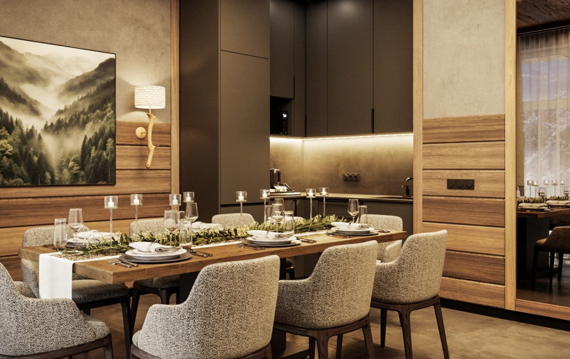 Одной из главных особенностей проекта является то, что из каждого апартамента открывается живописный вид на лес и заснеженные вершины гор Шерегеша.
