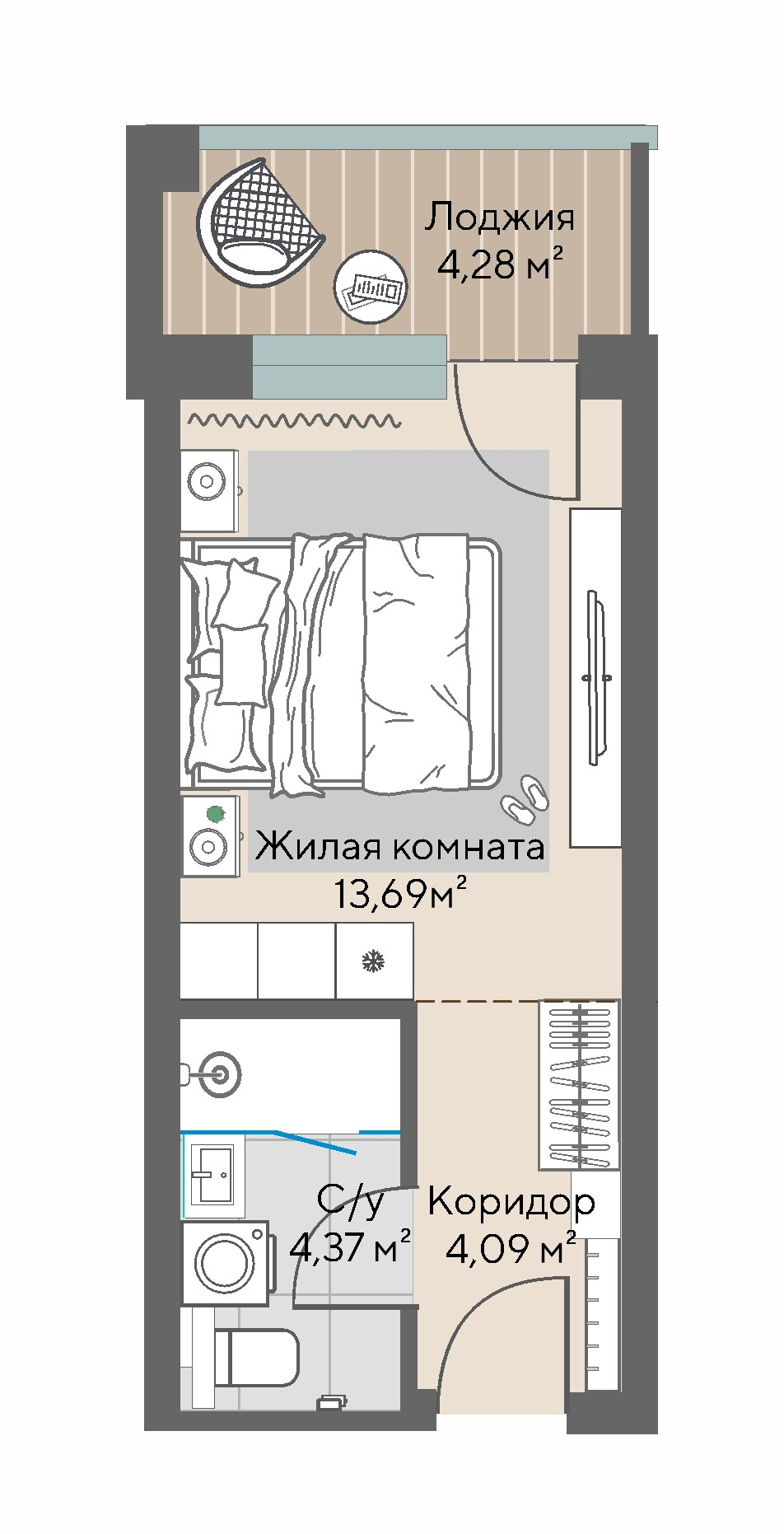 Гостиничный номер, 1-комнатная, №605, 24.29 м²