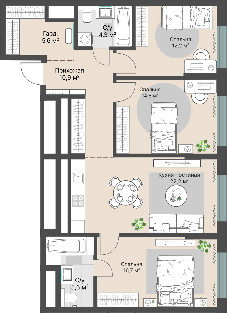3-комнатная, №216, 92.3 м²